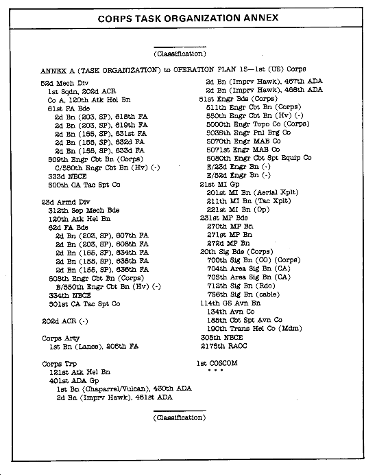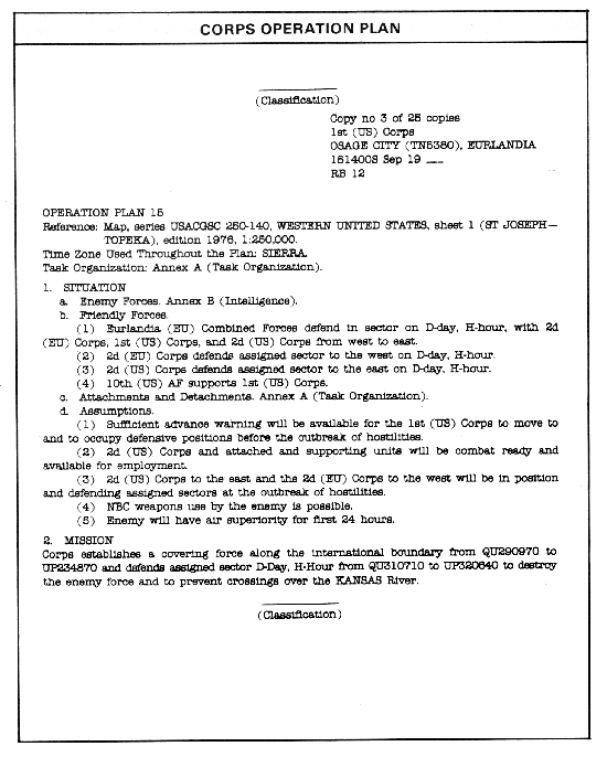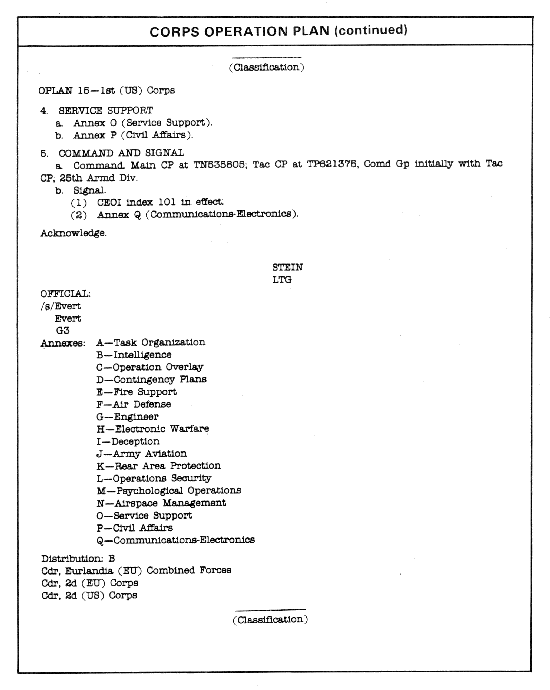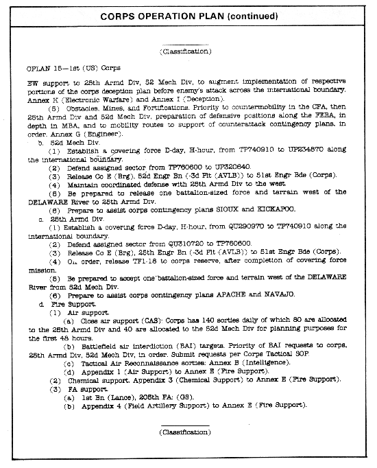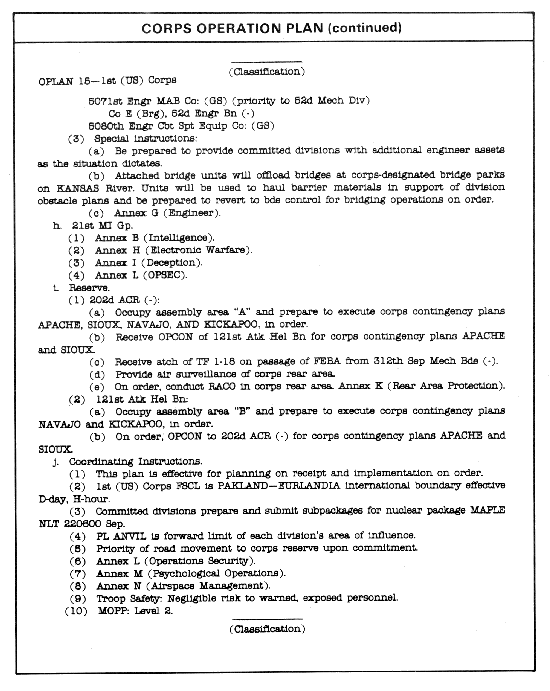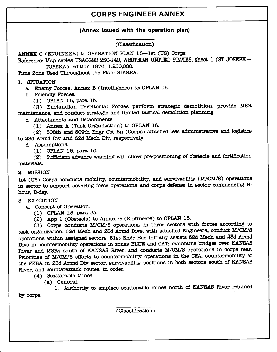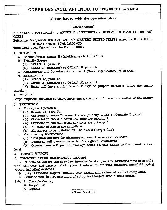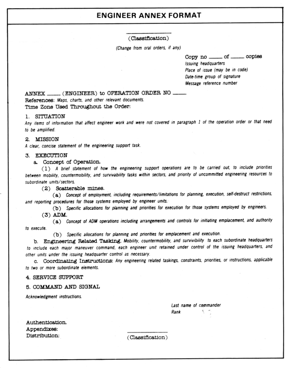 The purpose of this appendix is to provide sample operations orders, plans, and annexes that are commonly used by engineers and maneuver units in planning and executing countermobility tasks. The sample orders and plans provided in this appendix were extracted from FM 101-5, appendix G, and may be used as guides. Providing an accurate portrayal of the commander's concept and intent is critical in writing plans and orders.