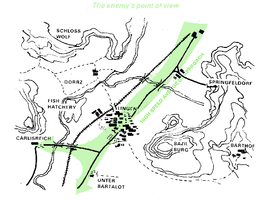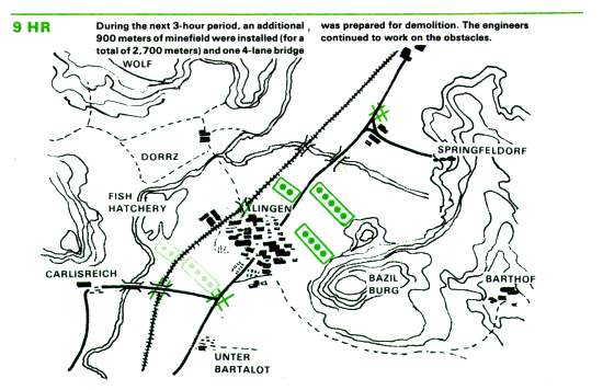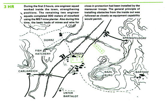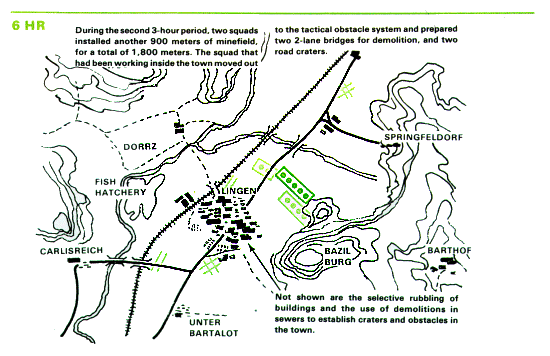 Concurrently, the engineers begin work on the obstacle plan, which was worked out after a joint reconnaissance by the infantry battalion commander and the supporting engineer platoon leader. The plan ties in minefields, bridge demolitions, and road craters with these obstacles already present: the town, the sunken road, and the Blau River with its associated ponds, marshes, and steep slopes.