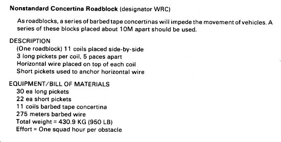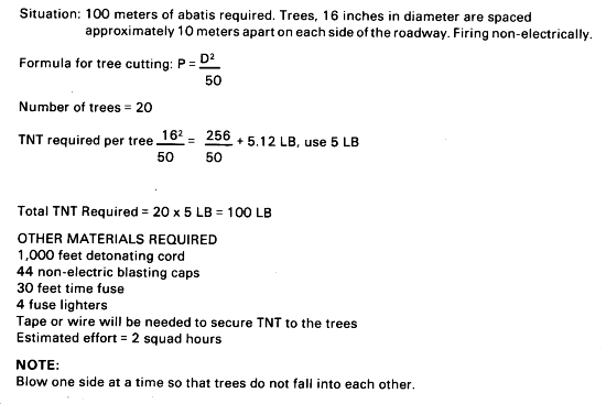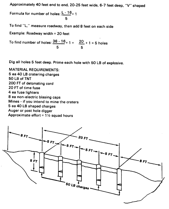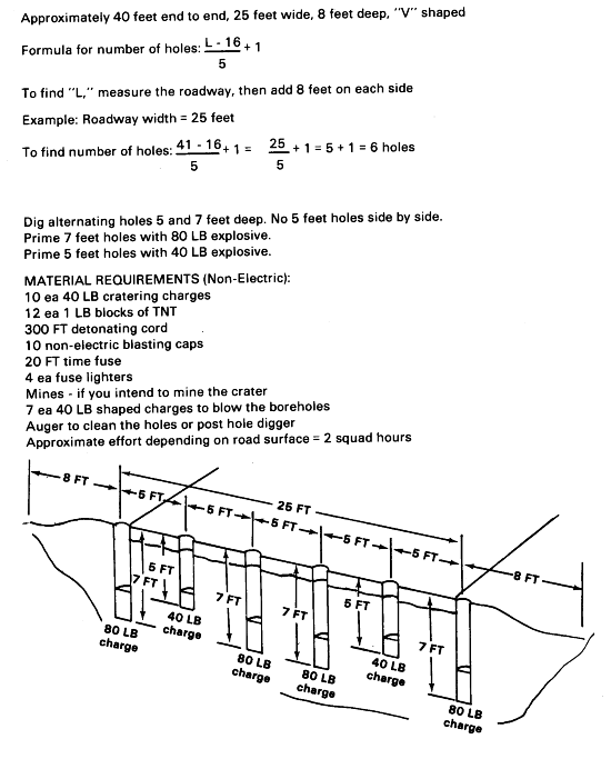 This appendix provides time, personnel equipment, and material estimating factors for obstacle planning. Reconnaissance or experience in a particular area may require that the planning factors be modified. The estimates given in this appendix are generally based upon "standard" sizes and types of obstacles. The basic purpose of the "standard" obstacle concept is to permit rapid estimating for resource requirements. Early estimation of resource requirements assists in personnel allocation and early requisition of material to accomplish the mission. For instance, if 40 hasty road craters are required in a particular obstacle plan, multiply the resources required for the hasty crater to get a reasonable estimate of the resources required. The estimates will not always be as accurate as an on-site reconnaissance; detailed obstacle planning is the most accurate method of determing resource requirements.