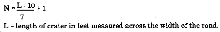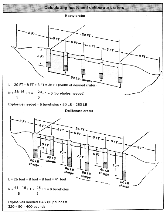This cratering method produces road craters which are more effective than those resulting from the hasty method but require more time and explosive. The deliberate method produces a deeper (7 to 8 feet), wider (25 feet), and steeper-sided (30 to 37 degrees) crater than the hasty method. The calculations for a deliberate crater are the same as a hasty crater with the following exceptions: