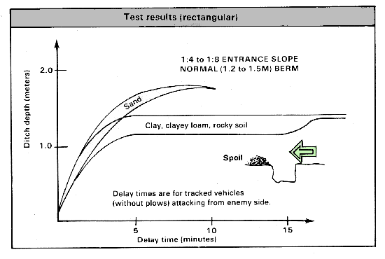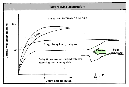 Results of tests on crossing triangular ditches in various soil types and resulting delay times are shown below. Triangular ditches are two to four times faster to cross than rectangular ditches when counterattacking. All tanks can easily cross from the friendly side, and most smaller combat vehicles can counterattack across if following in lanes where tanks have crossed.
