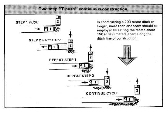Two dozers or two M9s (ACES) as a team. In step 1, vehicle #1 will start the ditch and push a load up to 9 to 10 meters (29 to 33 feet) from the start point, and then back up to start the cut again. In step 2, vehicle #2 will push the load away from the ditch to form a berm as vehicle #1 is backing up. The team continues performing in this manner to construct the ditch. This "T-push" method is suitable for construction of tank ditches in all soil types.