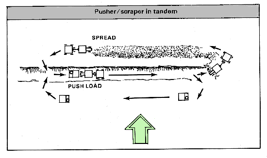 Tractor/scraper and M9s or dozers in tandem as a team. This method uses scrapers as earthmovers and generally requires a pusher (such as an M9, dozer, or bobtailed scraper) to assist loading of the scrapers. As the pusher and scraper exit the ditch, the scraper will turn toward the friendly side to dump the load along the berm; the pusher will exit on the enemy side and proceed back to the beginning of the ditch to pick up another scraper. This method produces excellent results, but requires training to reduce idle equipment time spent waiting for a pusher or scraper.