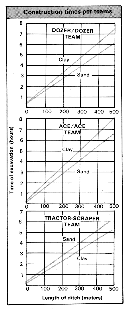 Basic production data of estimated construction times is shown for a 1.5 meter by 3.3 meter ditch using the teams indicated. These production rates are based upon field tests. No significant differences exist between construction of a triangular or a rectangular ditch. Valid test data does not exist for equipment combinations other than those listed.
