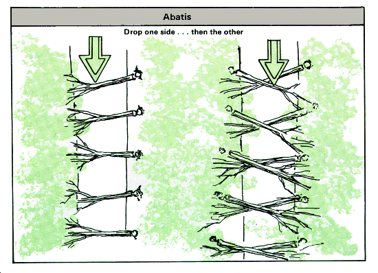 An abatis is an effective obstacle against tanks and other vehicles in a heavily-wooded area with few roads or trails. An abatis can be constructed rapidly using demolition to fell trees. The trees should be felled at a 45-degree angle to the road or trail. The tree should remain attached to the stump to make the obstacle more effective and difficult to clear.