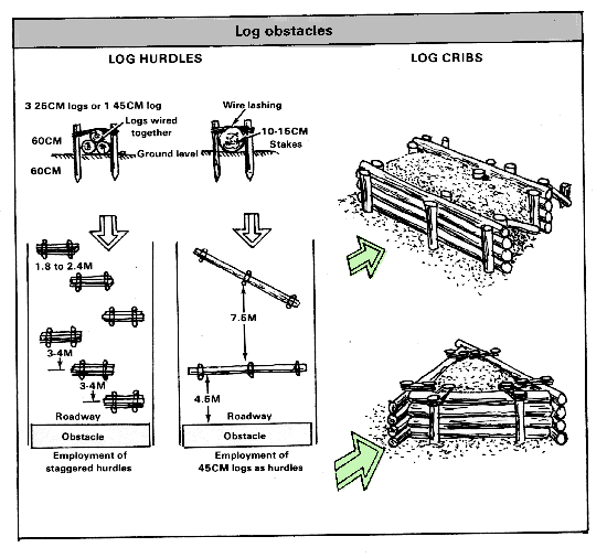Rectangular or triangular log cribs are used effectively as roadblocks where standing timber is available, and where such an obstacle cannot be readily bypassed. Unless substantially built, obstacles of this type are not effective against heavy-tracked vehicles. Cribs are strengthened by filling them with earth. It is preferable to obtain the earth by digging a shallow ditch in front of the obstacle. Log hurdles in front of a log crib will force vehicles to reduce speed and add to the effectiveness of the roadblock.