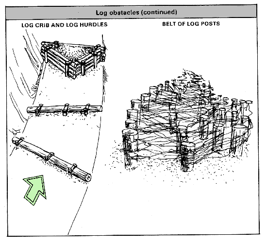 Log hurdles can be constructed using logs greater than 10 inches in diameter. The size of the logs will dictate if the hurdles should be constructed of single logs or multiple logs tied together. On level ground, log hurdles will not stop tanks, but will cause them to slow down. Hurdles will improve the effectiveness of other obstacles by slowing enemy vehicles and making them more vulnerable to friendly weapon fire.