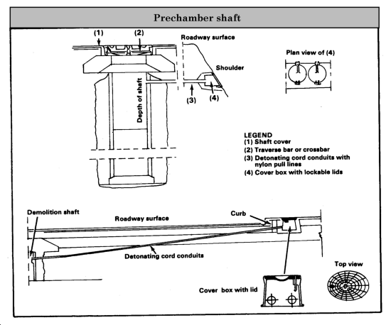 The prechamber shaft system consists of an array of several individual demolition shafts designed to permit rapid execution of crater obstacles. The demolition shafts are constructed of concrete pipe and located on roads, railroads, and bridge abutments.