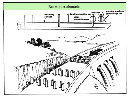 The beam post obstacle is designed for blocking roads at defiles without destroying the pavement. The obstacle consists of steel I-beam posts inserted into preconstructed shafts in the road width which prevents movement of all vehicles, wheeled or armored. A minimum of two double rows of shafts must be preconstructed into a concrete foundation. Within each double row, the individual shafts must also be staggered. Each beam post shaft is 80 centimeters (31 inches) deep and has a steel cover. The I-beam post is constructed of sectional steel, 2.2 meters (7.2 feet) long and weighing 216 kilograms. When inserted into the shaft it will extend 1.4 meters above the road surface. Each steel I-beam post is equipped with locking devices which prohibit the enemy from pulling them out of the shafts.