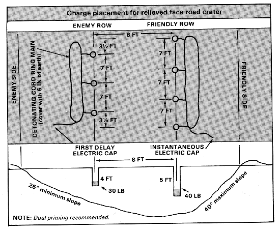 Step 4: If adequate means for sufficient time for delay firing are not available, acceptable results may be obtained by firing both rows simultaneously. However, the resulting crater will not have the same depth and trapezoidal shape as previously described.