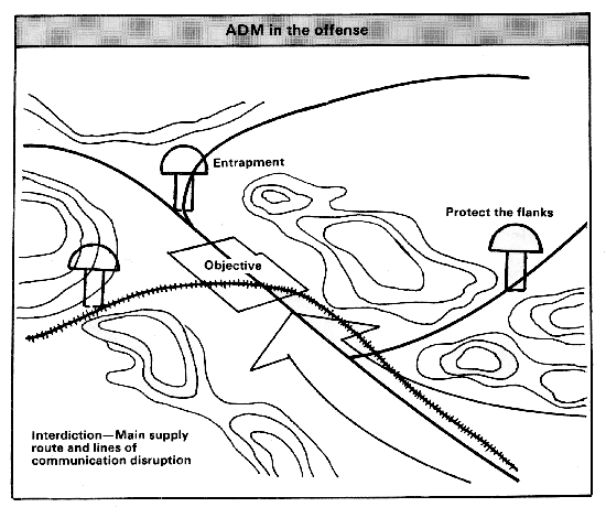 One of the roles that ADM can play in the attack is to provide protection to the flanks of the attacking formation, particularly in cross compartmented terrain. The ADM can be used to seal likely enemy counterattack avenues of approach. Another role for ADM in the offense is to create obstacles behind the enemy to prevent escape from the attacking forces. Yet another is a close interdiction role to separate enemy first and second echelon forces by destruction of key highway and rail bridges in enemy territory. The ADM can also be used in rear areas to disrupt main supply routes. Special Operations Forces (SOF) augmentation will most likely be required for ADM placed behind enemy lines.
