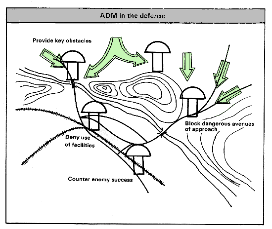The greatest utility of ADM is in defensive operations. The effective creation of critical obstacles can enable a relatively small force to hold off a large attacking force until reinforcements arrive. In the defense, ADM is used to create key obstacles, block dangerous avenues of approach, and deny the enemy use of important installations and facilities.