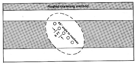 This method is useful against tanks traveling in defiles or road cuts where they must approach the crater straightway. The road crater is blasted using either the hasty or deliberate cratering methods, except the boreholes are drilled across the roadway at about a 45-degree angle as shown. Because of the angle tanks must attempt to cross, they tend to slip sideways and ride off their tracks.