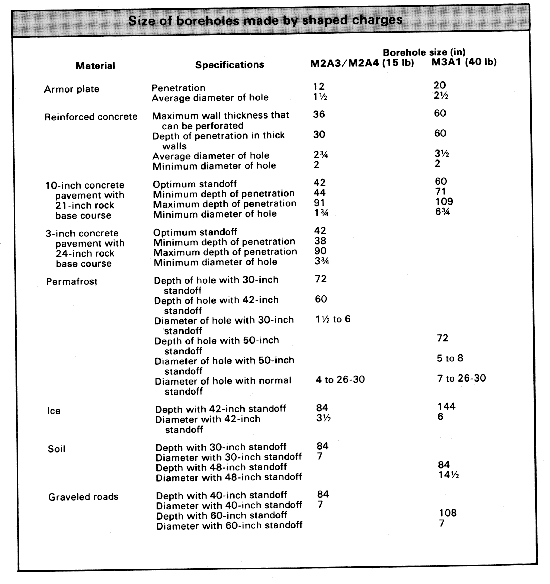 Standard shaped charges may be used to blast boreholes in both paved and unpaved surfaces for rapid road cratering with explosives. The 15-pound M2A4 shaped charge, detonated at 3 ½ foot-standoff, and the 40-pound M3A1 shaped charge, detonated at 5-foot standoff; will blast boreholes of depths up to 9 feet with diameters 7 inches and larger in both reinforced concrete pavements and gravel-surfaced roads. For maximum effectiveness, M3A1 shaped charges should be used to blast boreholes in thick, reinforced concrete pavements laid on dense highstrength base courses. The M2A4 shaped charges may be used effectively to blast cratering charge boreholes in reinforced concrete pavement of less than 6-inch thickness laid on thin base courses, or to blast boreholes in unpaved roads. Almost all types of military explosive, including the cratering charges, can be loaded directly into boreholes made by the M3A1 and M2A4 shaped charges. Shaped charges do not always produce open boreholes capable of being loaded directly with 7-inch diameter cratering charges without removing some earth or widening narrow areas. Many boreholes having narrow diameters but great depth can be widened simply by knocking material from the constricted areas with a pole or rod, or by breaking off the shattered surface concrete with a pick or crowbar. For road cratering on asphalt or concrete-surfaced roadways, blasting the boreholes with shaped charges will expedite the cratering task by eliminating the requirement for first breaching the pavement with explosive charges.