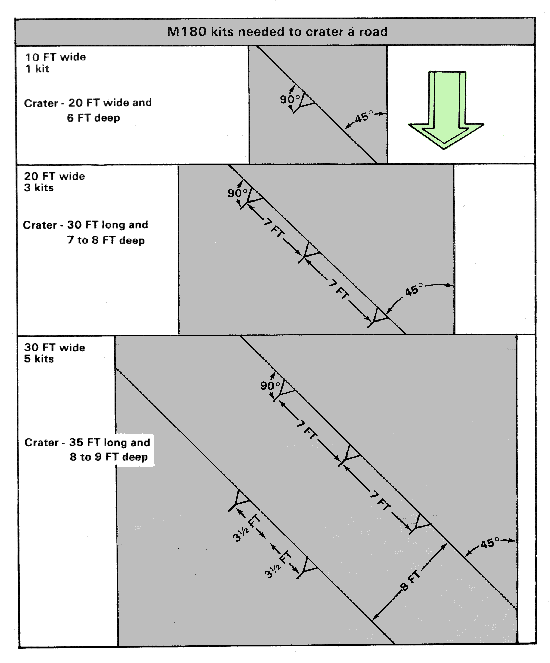The M180 demolition cratering kit is specially designed to produce craters in all types of soil and road surfaces, to include reinforced concrete. The kit is self-contained and consists of a shaped charge, a firing device, a 40-pound cratering charge, rocket motor, tripod, and demolition circuit. The M180 can create craters much more rapidly than methods previously described. The M180 can be employed in various configurations dependent upon the width of the desired crater. The figure below shows how to determine the number of kits necessary to crater roads of varying widths, and proper spacing and alignment. The M180 can be erected and fired within 20 minutes of arrival on site by two soldiers. It requires no site preparation.