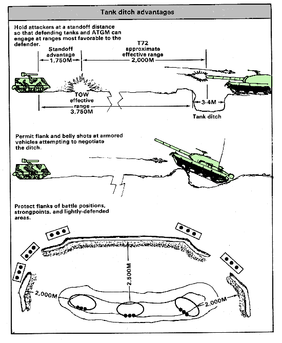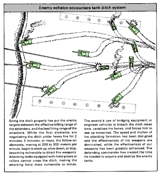 Tank ditches are one way to degrade an attacking force's speed and mobility. They impede the advance by slowing vehicles and confusing the crews. Well-planned tank ditches have the advantages shown and described.