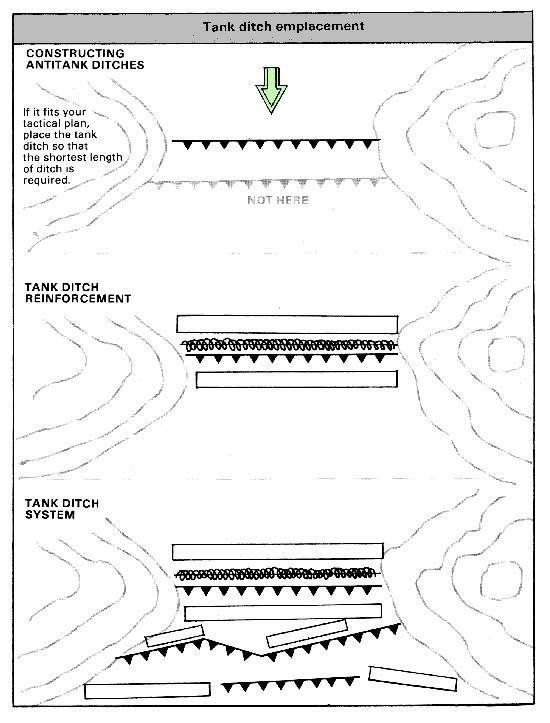 Construction of antitank ditches is time and equipment intensive. Maximum use should be made of the terrain. Also, the shortest antitank ditch or ditch system possible should be used.