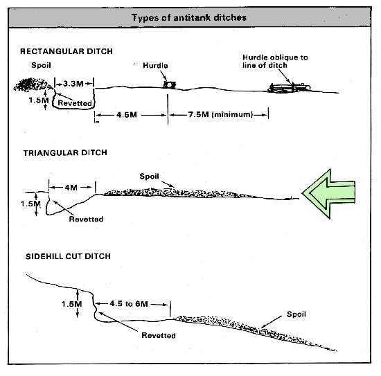 The configuration of the most effective tank ditch has been a subject of much discussion and field testing with such constraints as time and equipment available, and soil conditions. The most efficient ditch is either a rectangular or triangular ditch.