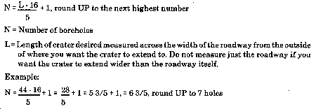 Step 1: On dirt or gravel-surfaced roads, drill or blast two rows of boreholes 8 feet apart, spacing the boreholes on 7-foot centers. On hard-surfaced roads, drill the two rows 12 feet apart. The number of charges for the friendly side row can be calculated by the formula: