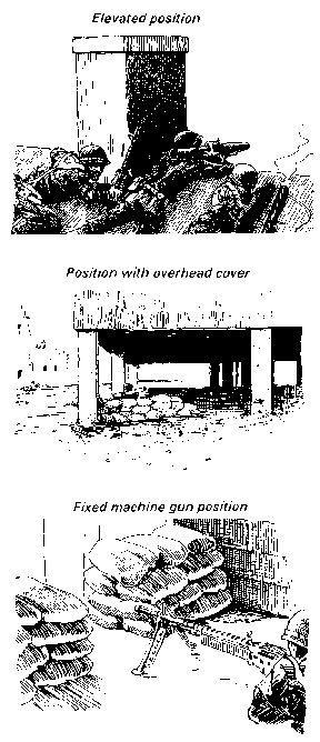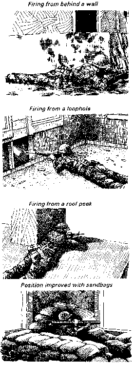 In urban areas, the prime concerns for individual fighting positions are exposure and muzzle flash. When firing from behind a wall, the soldier fires around cover (when possible), not over it. When firing from a window, the soldier avoids standing in the opening and being exposed to return fire. Also, the soldier avoids firing with the gun muzzle protruding, especially at night when muzzle flash is so obvious. When firing from a loophole, the soldier gains cover and concealment. The soldier is positioned well back from the loophole to keep the weapon from protruding and to conceal muzzle flash. When firing from the peak of a roof, soldiers use available cover. The principles for individual fighting positions also apply for crew-served weapons positions, but with the following added requirements. When employing recoilless weapons (90-mm RCLR and LAW), the soldiers select positions which allow for backblast. Shown is a building corner improved with sandbags to make an excellent firing position. Similarly, another means of allowing for backblast while taking advantage of cover in an elevated position is also shown. When structures are elevated, positions are prepared to take advantage of overhead cover. However, care is taken to ensure that backblast is not contained under the building, causing damage or collapse of the structure, or possible injury to the crew. When machine gun positions are fixed, the same consideration as individual positions is given to exposure and muzzle location. For further information on camouflage operations, refer to FM 5-20. |