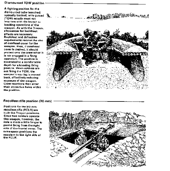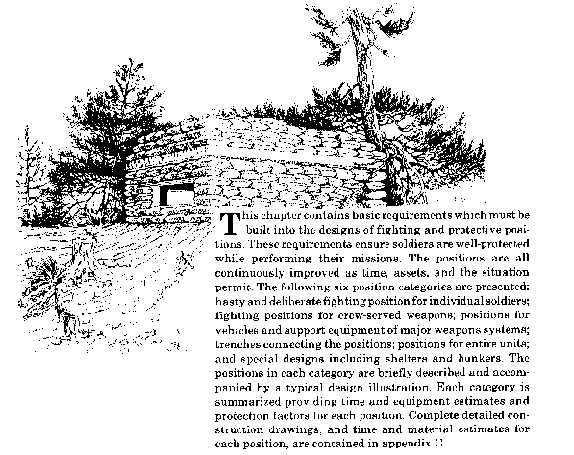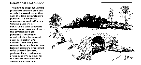 This section contains designs for fighting and protective positions for major weapons systems vehicles and their support equipment. Initially, vehicles use the natural cover and concealment in hide positions to increase survivability. As time, assets, and situation permit, positions are prepared using organic excavation equipment or engineer support. Priority is given to those vehicles containing essential mission-oriented equipment or supplies. Drivers and crews should use these fighting positions for individual protection also.