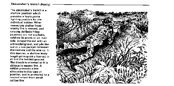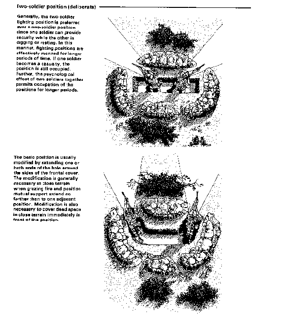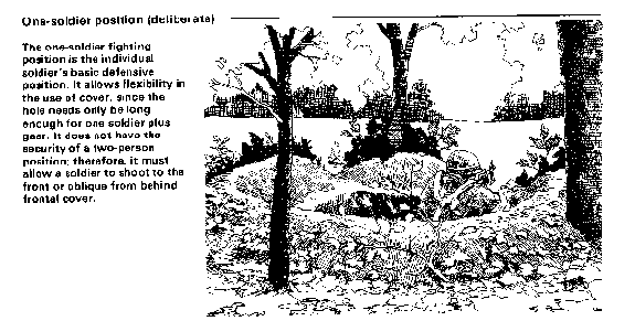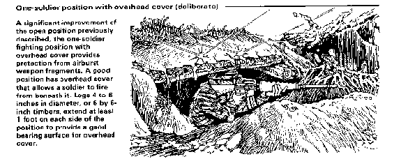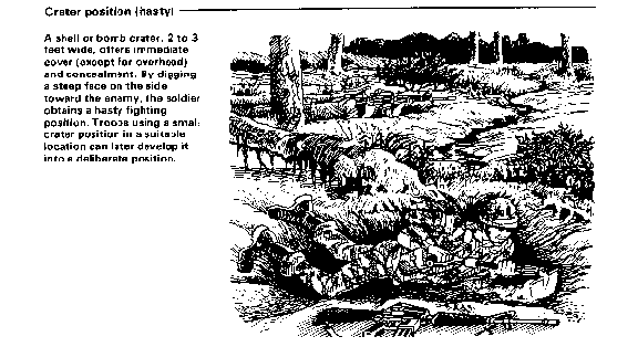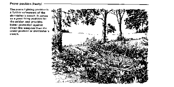 When time and materials are limited, troops in contact with the enemy use a hasty fighting position located behind whatever cover is available. It should provide frontal protection from direct fire while allowing fire to the front and oblique. For protection from indirect fire, a hasty fighting position is located in a depression or hole at least l ½ feet deep. The following positions provide limited protection and are used when there is little or no natural cover. If the unit remains in the area, the hasty positions are further developed into deliberate positions which provide as much protection as possible.