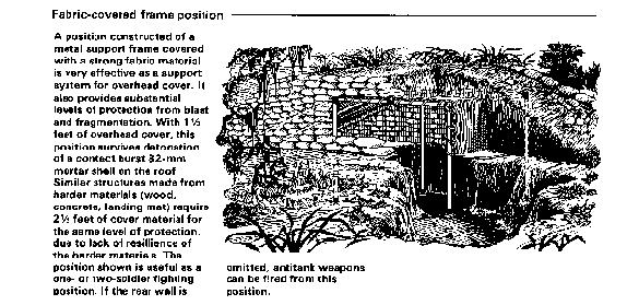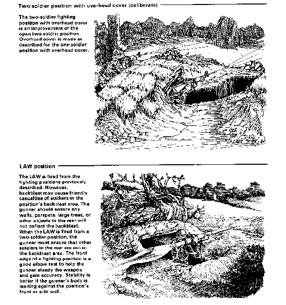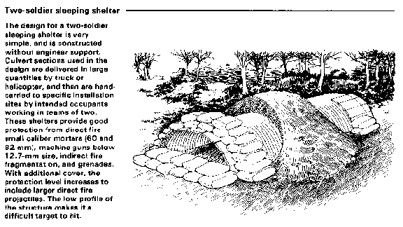The following two positions are designed for use by two or more individuals armed with rifles or machine guns. Although these are beyond the construction capabilities of non-engineer troops, certain construction phases can be accomplished with little or no engineer assistance. For example, while engineer assistance may be necessary to build steel frames and cut timbers for the roof of a structure, the excavation, assembly, and installation are all within the capabilities of most units. Adequate support for overhead cover is extremely important. The support system should be strong enough to safely support the roof and soil material and survive the effects of weapon detonations.