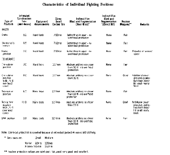 The table below summarizes the hasty and deliberate individual fighting positions and provides time estimates, equipment requirements, and protection factors.