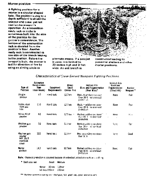 The table below summarizes crew-served weapons fighting positions and provides time estimates, equipment requirements, and protection factors.