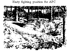 Hasty fighting positions for combat vehicles including armored personnel carriers (APCs), combat engineering vehicles (CEVs), and mortar carriers take advantage of natural terrain features or are prepared with a minimum of construction effort. A frontal parapet, as high as practical without interfering with the vehicles' weapon systems, shields from frontal attack and provides limited concealment if properly camouflaged. Protection is improved if the position is made deeper and the parapet extended around the vehicle's sides. Because of the false sense of security provided by parapets against kinetic energy and hypervelocity projectiles, hasty vehicle fighting positions with parapets are not recommended for tanks, infantry fighting vehicles (IFVs), and improved TOW vehicles (ITVs). Hasty fighting positions do offer protection from HEAT projectiles and provide limited concealment if properly camouflaged. As the tactical situation permits, hasty positions are improved to deliberate positions.