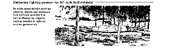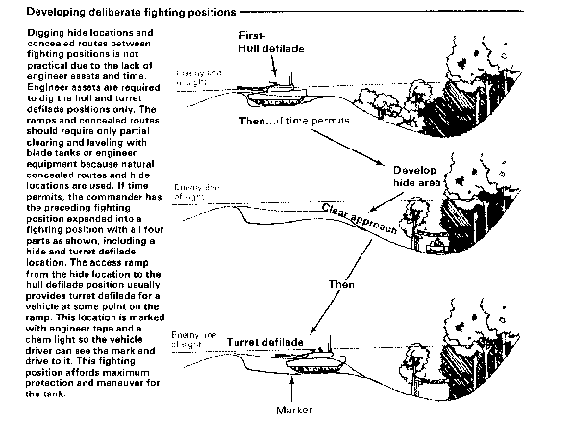 Deliberate fighting positions are required to protect a vehicle from kinetic energy hypervelocity projectiles. The position is constructed in four parts: hull defilade, concealed access ramp or route, hide location, and turret defilade. Positions formed by natural terrain are best because of easy modification; however, if preparation is necessary, extensive engineer support is required. Each position is camouflaged with either natural vegetation or a camouflage net, and the spoil is flattened out or hauled away. All fighting positions for fighting vehicles (tanks, IFVs, ITVs) are planned as deliberate positions. Since the lack of time usually does not allow the full construction of a deliberate position, then only some parts of the position's construction are prepared. For example, the complete fighting position for a tank requires the construction of a hull defilade, turret defilade, concealed access ramp or route, and hide location all within the same fighting position. The maneuver team commander uses organic and engineer earthmoving assets and usually constructs fighting position parts in the following order: