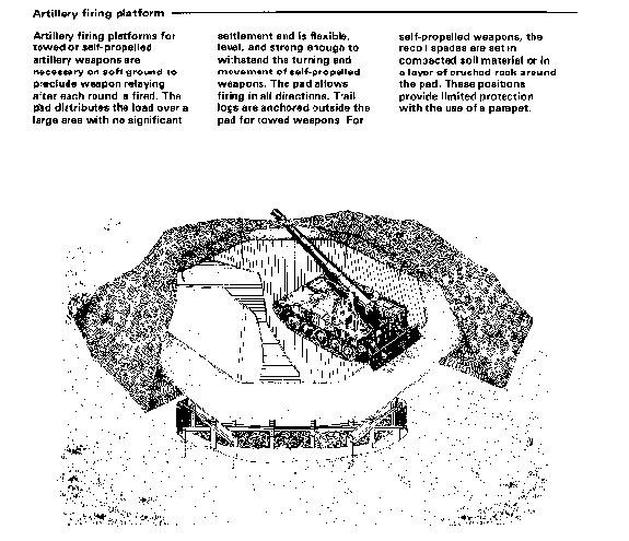 Artillery firebases are of extreme tactical importance and require substantial protective construction. The most frequently constructed firebase houses are an infantry battalion command element, two infantry companies, a 105-mm howitzer battery, and three to six 155-mm howitzer batteries. A firebase housing the above units consists of the following facilities: infantry TOCs, artillery FDCs, ammunition storage positions, garbage dump, command and control helicopter pad, logistics storage area and sling-out pad, artillery firing positions, helicopter parking area and refuel point, and hardened sleeping protective positions. Firebases usually are surrounded by a protective parapet with perimeter fighting positions, two or more bands of tactical wire, hasty protective minefield, and a cleared buffer zone to provide adequate fields of fire for perimeter defense. (Field Manual 5-102 provides detailed information on minefield.) If a local water source is available, an airportable water supply point is setup to provide water for the firebase and the units in the local area.
