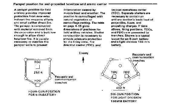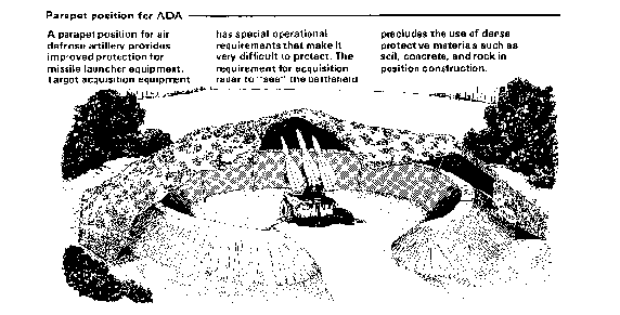 Parapets positioned at the front of or around major weapons systems will provide improved protection from direct fire and from blast and fragments of indirect fire artillery, mortar, and rocket shells. At its base, the parapet has a thickness of at least 8 feet. Further, the parapet functions as a standoff barrier for impact-detonating direct fire HEAT and ATGM projectiles. The parapet should cause the fuzes to activate, thereby increasing survivability for the protected vehicles. If the expected enemy uses kinetic energy direct fire armor piercing or hypervelocity projectiles, it is impossible to construct parapets thick enough for protection. To protect against these projectiles, deep-cut, hull defilade, or turret defilade positions are prepared. The dimensions for fighting and protective positions for essential vehicles are constructed no larger than operationally necessary.