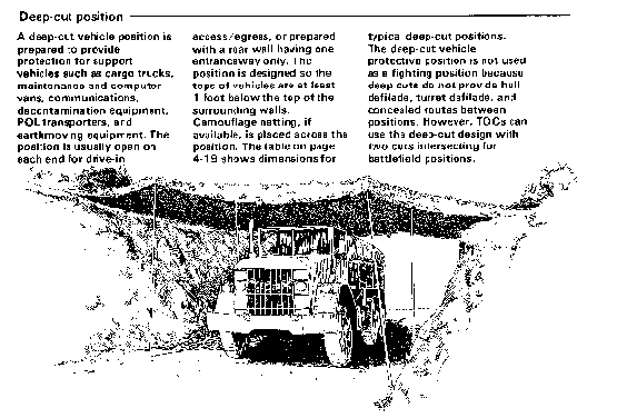 Vehicle protective positions are constructed for vehicles and weapons systems which do not provide direct fire against the enemy. The positions are neither hasty nor deliberate because they all require extensive engineer assets and construction materials to build. Unless separate overhead cover is constructed, the positions do not provide blast protection from indirect fire super quick, contact, or delay fuze shells. The positions do, however, provide medium artillery shell fragmentation protection from near-miss bursts greater than 5 feet from the position, and from direct fire HEAT projectiles 120mm or less fired at the base of the position's 8-foot thick parapet.