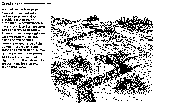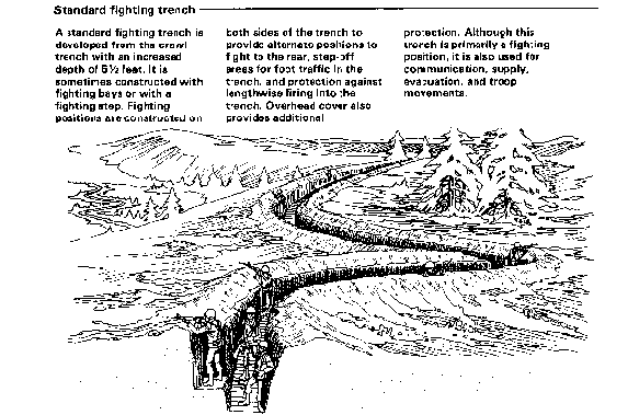 Trenches are excavated to connect individual fighting positions and weapons positions in the progressive development of a defensive area. They provide protection and concealment for personnel moving between fighting positions or in and out of the area. Trenches are usually included in the overall layout plan for the defense of a position or strongpoint. Excavating trenches involves considerable time, effort, and materials, and is only justified when an area is occupied for a long time. Trenches are usually open excavations, but covered sections provide additional protection if the overhead cover does not interfere with the fire mission of the occupying personnel. Trenches are difficult to camouflage and are easily detected, especially for the air. Trenches, as other fighting positions, are developed progressively. They are improved by digging deeper, from a minimum of 2 feet to about 5 ½ feet. As a general rule, deeper excavation is desired for other than fighting trenches to provide more protection or allow more headroom. Some trenches may also require widening to accommodate more traffic, including stretchers. It is usually necessary to revet trenches that are more than 5 feet deep in any type of soil. In the deeper trenches, some engineer advice or assistance is usually necessary in providing adequate drainage. Two basic trenches are the crawl trench and the standard fighting trench.