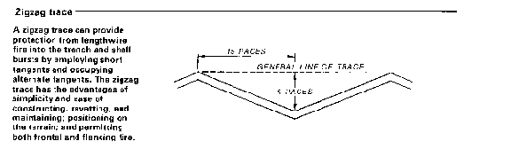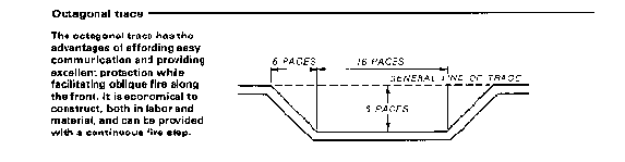 Each trench is constructed to the length required and follows either an octagonal or zigzag trace pattern. Special combinations and modifications are made to meet battlefield demands.
