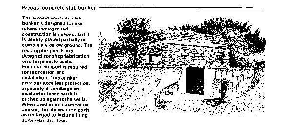 Bunkers are larger fighting positions constructed for squad-size units who are required to remain in defensive positions for a longer period of time. They are built either above-ground or below ground and are usually made of reinforced concrete. Because of the extensive engineer effort required to build bunkers, they are usually made during strong-point construction. If time permits, bunkers are connected to other fighting or supply positions by tunnels. Prefabrication of bunker assemblies affords rapid construction and placement flexibility. Bunkers offer excellent protection against direct fire and indirect fire effects and, if properly constructed with appropriate collective protection equipment, they provide protection against chemical and biological agents.