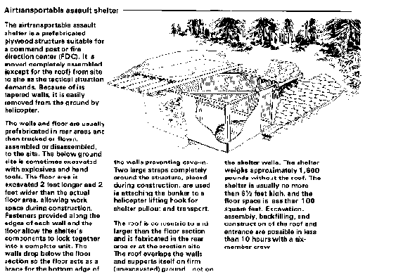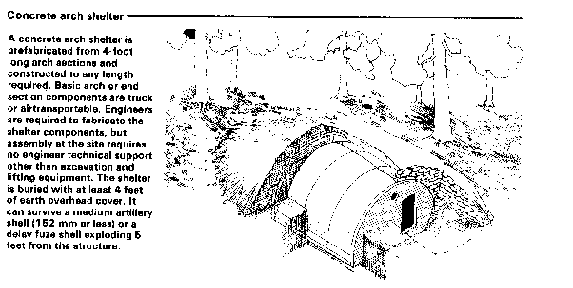 In a highly fluid battle situation where frequent displacement of the forward support company is required, the company cannot afford the effort required to construct extensive protective positions and shelters due to conflicts with basic mission accomplishment. Further, the company base of operations is close to the brigade trains area which is relatively secure from overt ground attack. Also, a large portion of the company is habitually employed away from the company area providing contact teams to supported units. Thus, the basic protection requirements are simple positions for individuals and crew-served weapons. The specific number of positions is determined by the size of the company position perimeter and the number of personnel and crew-served weapons available to protect the perimeter. In the principal company area, individual positions are constructed near their billeting areas and on the periphery of their work sections. Simple cut-and-cover or other expedient shelters are constructed next to principal shop facilities to provide immediate protection from artillery/ air attack. These shelters are usually not larger than 10-person shelters.