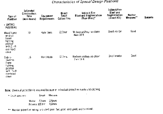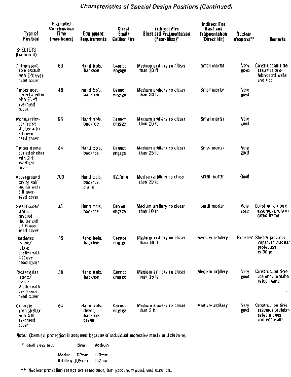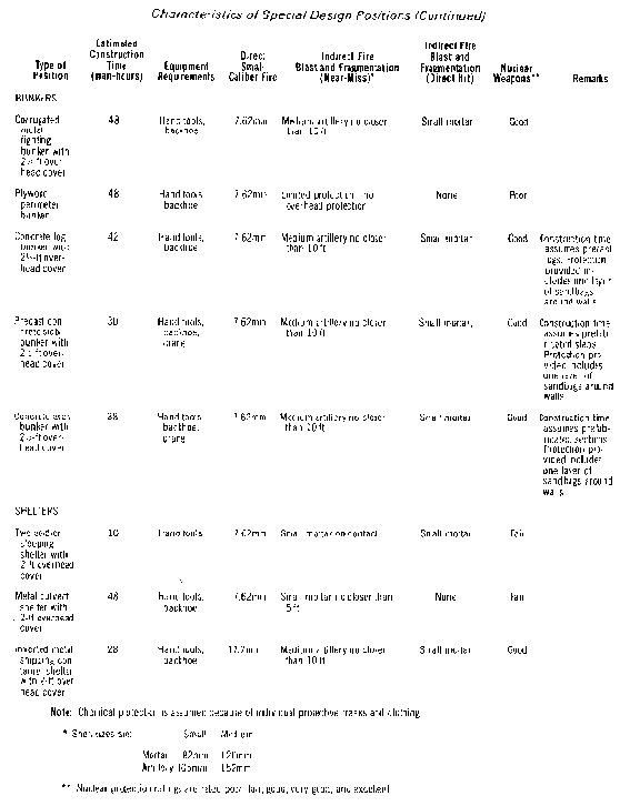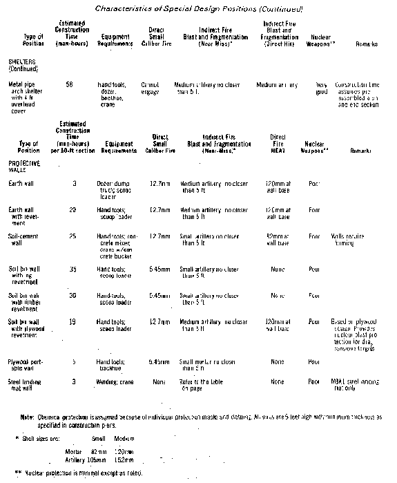 The table summarizes construction estimates and levels of protection for the fighting positions, bunkers, shelters, and protective walls presented in this section.